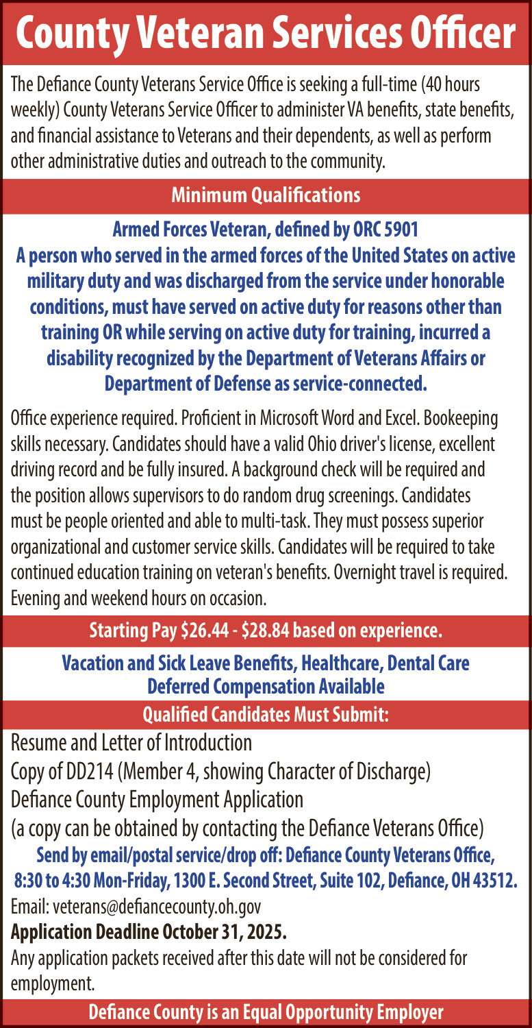 Oct 04, 2025. The Defiance County Veterans Service Comission Government Jobs from Crescent News Jobs