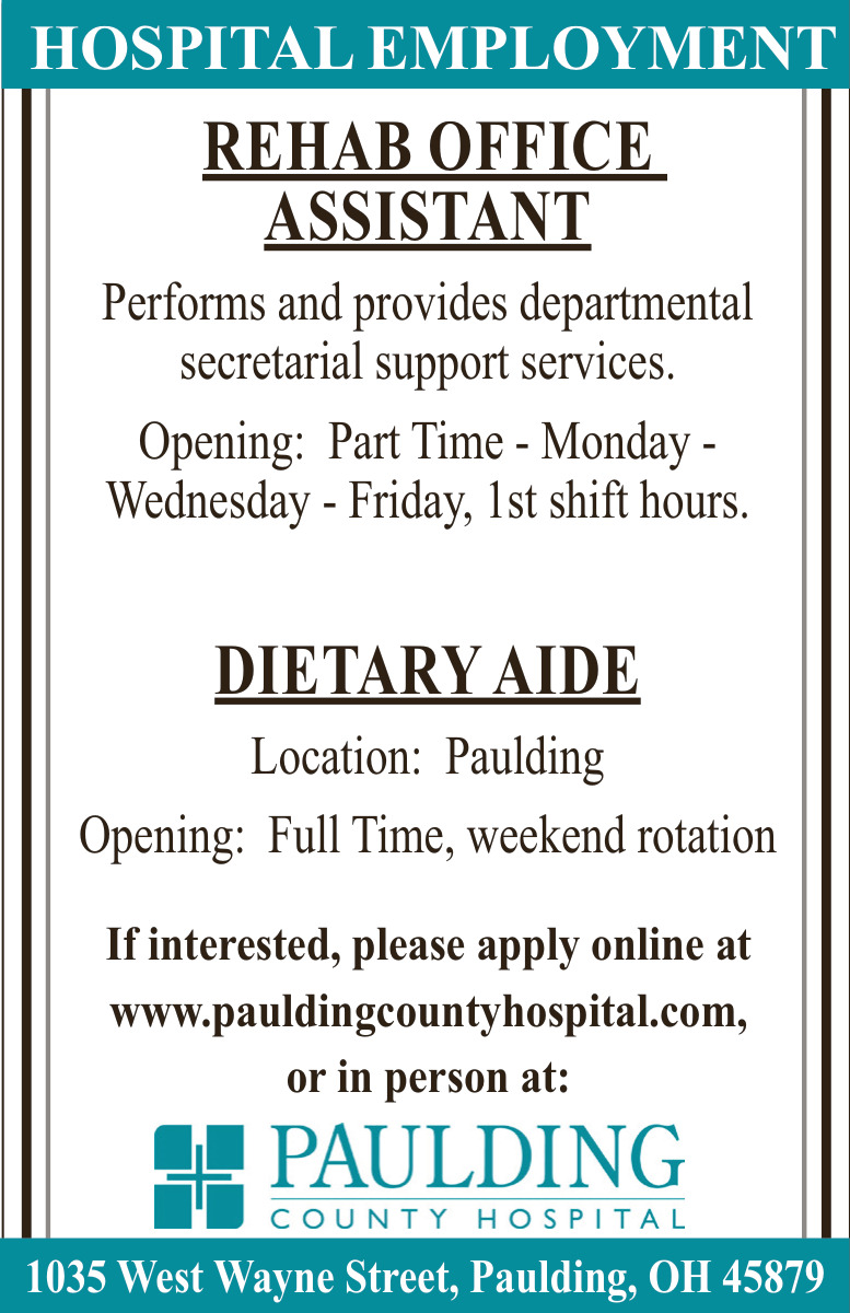 Rehab Office Assistant Jobs Opening in Paulding, OH