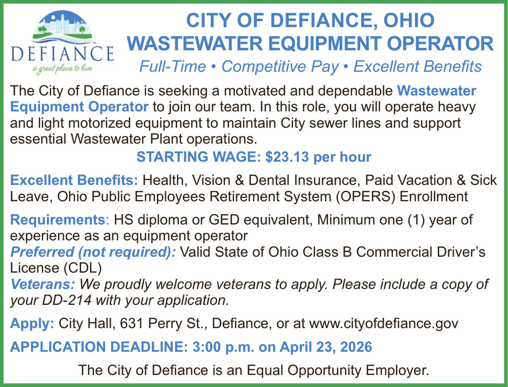 Apr 11, 2026. City of Defiance Operator Jobs from Crescent News Jobs